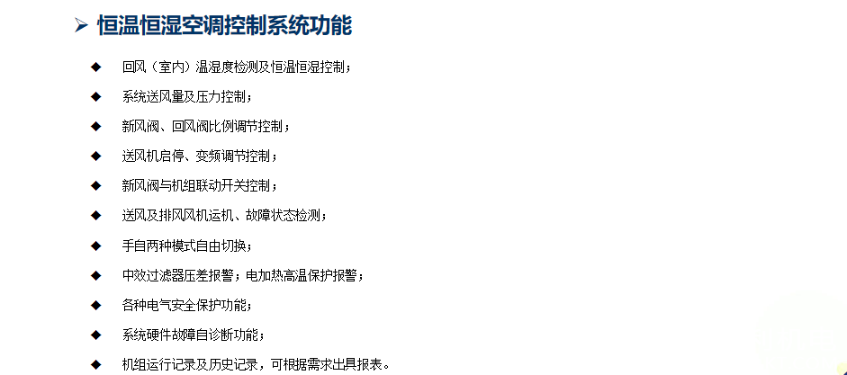 恒溫恒溫空調(diào)控制系統(tǒng)專門應(yīng)用于行業(yè)凈化空調(diào)系統(tǒng),可實(shí)現(xiàn)系統(tǒng)溫濕度、風(fēng)量、壓差梯度的自動(dòng)調(diào)節(jié)及各種安全保護(hù)、節(jié)能運(yùn)行等控制功能,最大限度地保證潔凈廠房溫濕度、壓差的控制以及能源管理自動(dòng)化、設(shè)備運(yùn)行集中監(jiān)控的系統(tǒng)控制功能。
