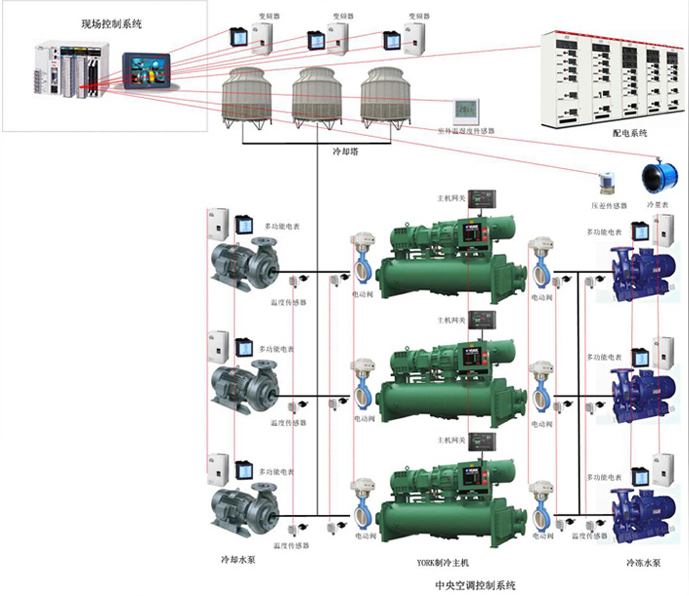 1、水泵變頻控制:通過實時檢測冷卻水系統(tǒng)供回水溫度及室外氣象參數(shù),結(jié)合冷卻塔的工作效率,動態(tài)調(diào)節(jié)冷卻水泵的頻率,從而改變冷卻水流量,達到節(jié)約系統(tǒng)運行能耗的目的。