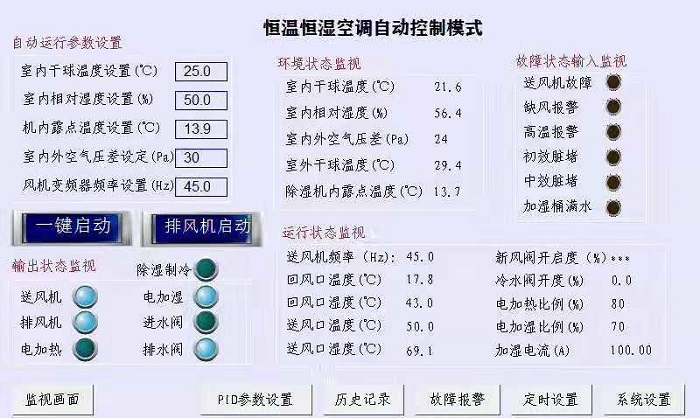 恒溫恒濕空調(diào)系統(tǒng)由控制器、人機(jī)界面、變頻器、溫度傳感器,溫濕度傳感器,水閥執(zhí)行器、風(fēng)閥執(zhí)行器、高溫?cái)嗦菲?、風(fēng)壓開(kāi)關(guān)等組成。