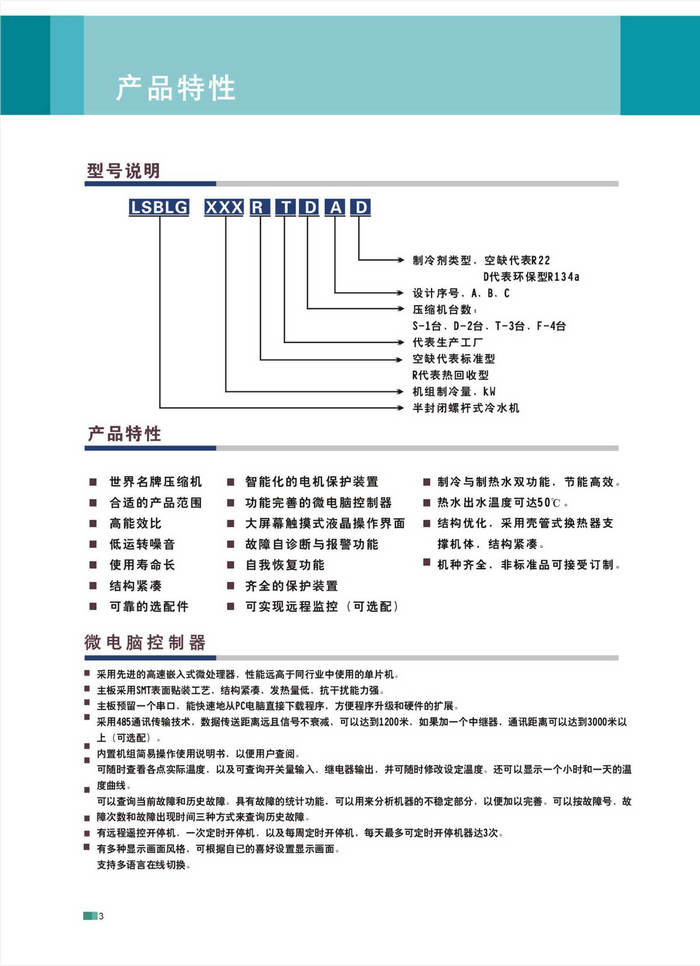 水冷冷水機(132KW-2160KW) 單螺桿機采用三菱電機進口壓縮機,使得高低壓之間串氣減至最小, 保證機組低噪音、平穩(wěn)性和高可靠性 雙螺桿機采用高效率螺桿式壓縮機,壓差方式給油,無需外加油泵 配置SIEMENS人性化微電腦控制系統(tǒng) 強大的研發(fā)能力可為客戶特別設(shè)計非標產(chǎn)品 采用綠色、環(huán)保的R-134a制冷劑...